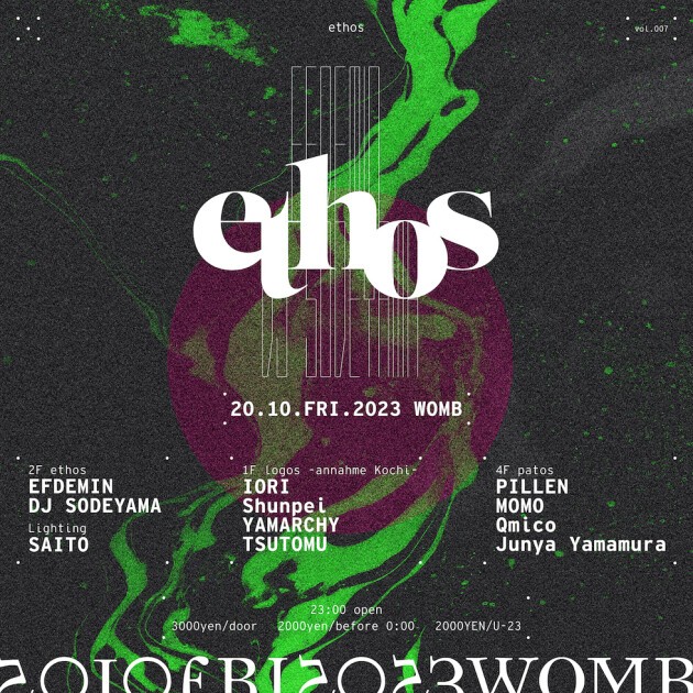 そして1F logos フロアは、今年10月末に高知県を舞台にして開催する野外フェス annahme とのコラボレーションが実現。日本全国の実力ある DJ らが集結するこのフェスティバルに、東京からヘッドライナーとして招聘されている IORI と YAMARCHY らを筆頭にして、高知ローカルシーンでその名を知らぬものはいない Shunpei が満を持して来京する。ethos 主宰の TSUTOMU もこの特別なフロアに音楽で華を添えることになった。