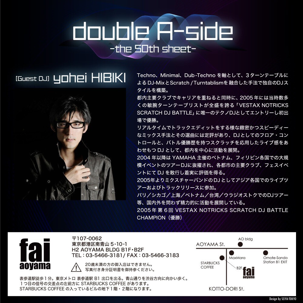 ゲストDJにはTechno、Minimal、Dub-Technoを軸として、3ターンテーブルによるDJ-MixとScratch/Turntablismを融合した手法で独自のDJスタイルを構築したyohei HIBIKIを再び招集。