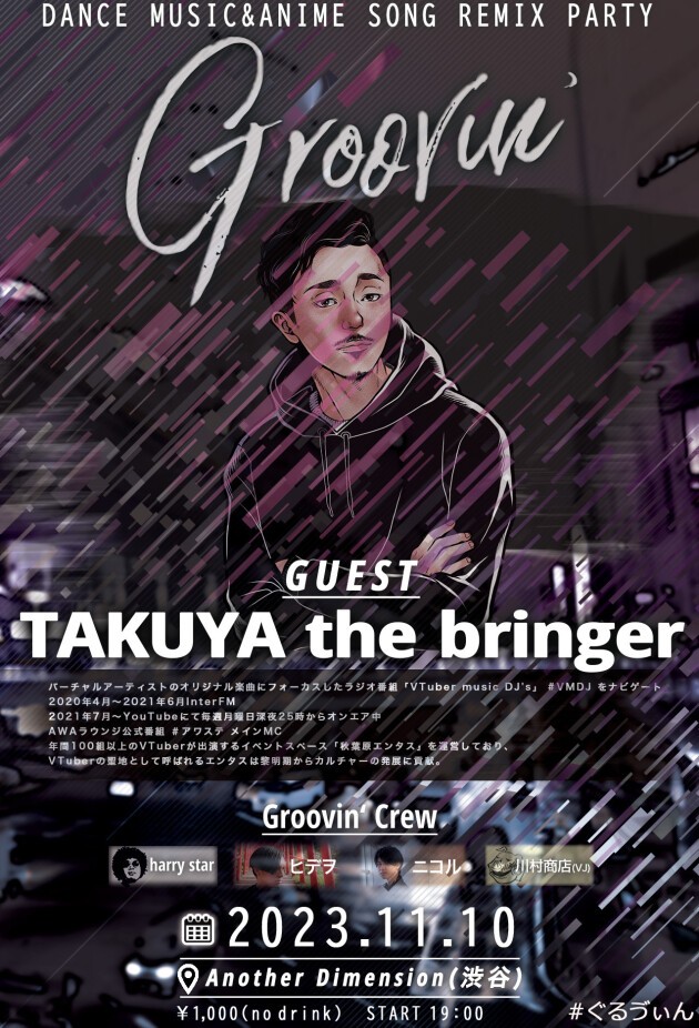 また、2018年8月より、グルーヴを重視したクラブミュージック+アニソンremixのパーティ「Groovin’」を主催する。