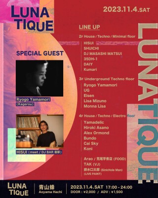 青山蜂で不定期開催しているHouse/Techno Party『LUNATIQUE』は、11/4(土)に3フロアを解放しオリジナル・ラインナップで再び堂々開催!