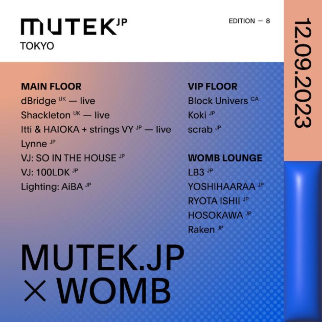 今年も、世界最前線のデジタル・アートとエレクトロニック・ミュージックによる国際的なフェスティバル MUTEK と WOMB とのコラボレーションイベントが、12/8(金)、9(土)の2日間で開催。