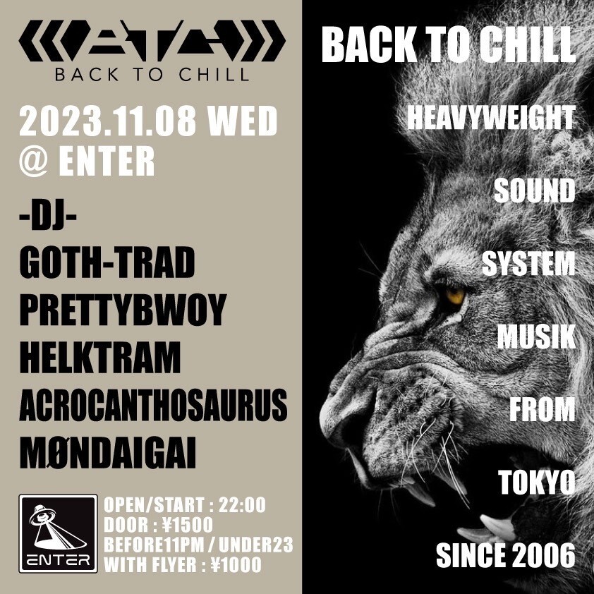 主宰GOTH-TRADがUKのダブステップ・シーンと繋がるきっかけとなった自身のタイトル「Back To Chill」を由来に、2006年に始動した同名のパーティは日本初のレギュラー・ダブステップ・パーティとして話題を呼び、国内のヘッズのみならず、海外のベース・ミュージック・ファンからも注目を集め、今やダブステップ/ベースミュージック・パーティの最高峰かつ代名詞にもなっている。今年9月には17周年のアニバーサリーパーティを開催し、オールナイト、アフターを含める11時間、床が震えるほどのベースが唸り続け、多くのベースミュージックラバーを低音の沼に引き入れた。17周年の節目を終えての平日開催、今回はBACK TO CHILLよりGOTH-TRAD、HELKTRAM、MØNDAIGAIが出演。ガラージ、グライムを軸に楽曲制作を開始し、自身の軸である2ジャンルの境界線を破壊して、独自の世界観のトラックを作り出し、2017年には北京から上海ツアーを敢行したPRETTYBWOY、UKミュージックを中心に、様々な4つ打ちミュージックを網羅し、レイヴィーかつアッパーなダンスミュージックからダークな世界観まで幅広い対応力とスキルを持ちながら、足軽なフットワークによる遊びの経験値と、DJの現場の経験値を兼ね備えたゲットーなACROCANTHOSAURUSを招き、体が震えるほどの重低音を体感できる贅沢な平日夜をぜひ体験してほしい。