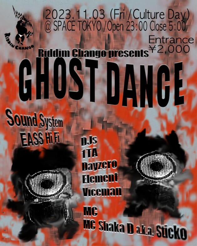 Riddim Chango Recordsがお届けするサウンドシステム・ダンス、「GHOST DANCE」が始動!今回は新宿SPACEにてeastaudioサウンドシステムの別名義EASS Hi Fiを導入し、Fire BallやScorcher Hi Fiでの活動で知られるShaka D a.k.a. StickoをMCに迎え、Zam Zam Sound/Livity Soundでのリリースを重ねるDJ/プロデューサーのDayzero、レゲエ、ダンスホールを独自のセンスで発信するVicemanがセレクターとして登場。そして、最新リリースを控えるRiddim ChangoのElementと1TAのレジデンツがキラーなDUB空間を演出する。地下1Fの暗闇から放たれる圧倒的な超低音空間を体感しよう。