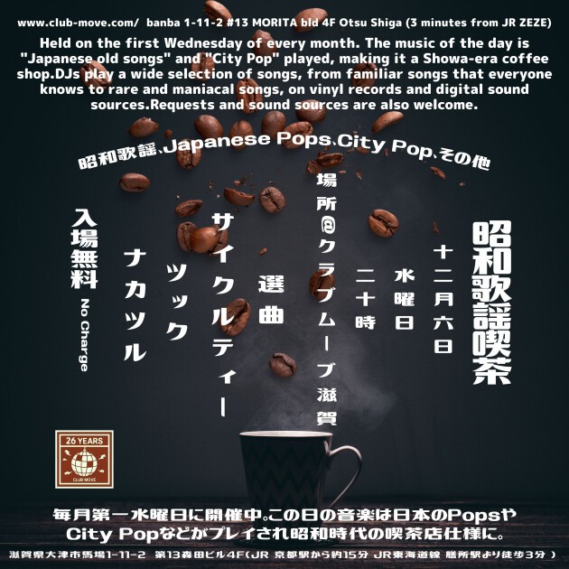Held on the first Wednesday of every month. The music of the day is "Japanese old songs" and "City Pop" played, making it a Showa-era coffee shop.DJs play a wide selection of songs, from familiar songs that everyone knows to rare and maniacal songs, on vinyl records and digital sound sources.Requests and sound sources are also welcome.