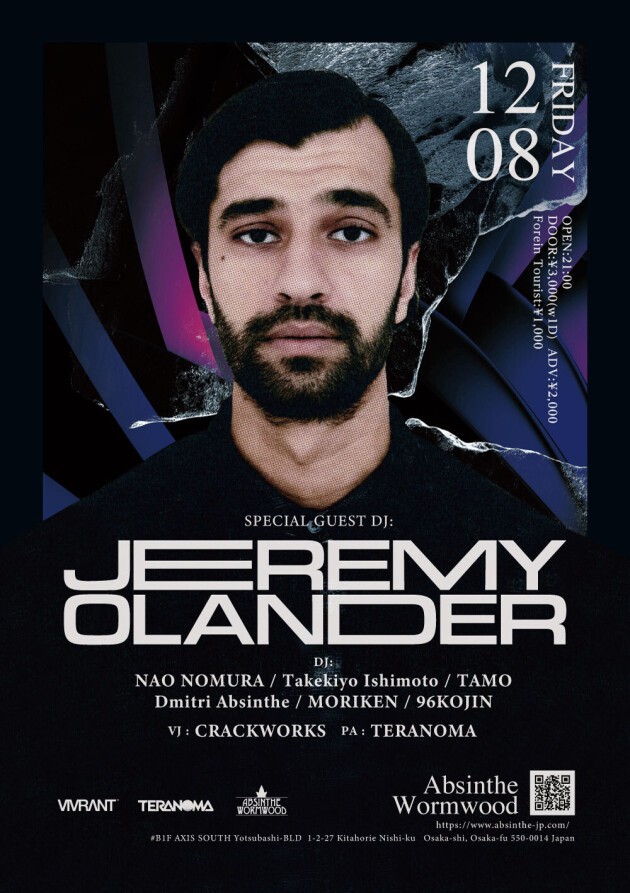 スウェーデンのエレクトロミュージックレーベル『VIVRANT』の首領、Jeremy Orlanderが5年ぶりとなる大阪公演を、アメ村・四ツ橋の大人気店Cafe Absintheの20周年のDay1として同ビルB1FのAbsinthe Wormwoodにて開催。