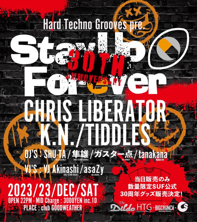 日本におけるレイブカルチャーは何処にあるのか、今もそれは記憶の断片を繋ぎながら時代の変革によってさまざまな形をもっているだろう。 我々は今どうあるべきか。栄えある30周年を迎え、今なおアクションを続け全てのダンスカルチャーへ武器の代わりに TB-303 を携えた 平和と友愛を訴える生きる伝説 Chris Liberator. TIDDLES そして唯一のSUFメンバーであり日本のアシッド・テクノ・シーンの第一人者、MASS 主宰 K.N.をゲストに長らく名古屋でハードテクノシーンを支え続けるサポートDJと大きな喜びをダンスフロアで分かち合いたい。