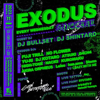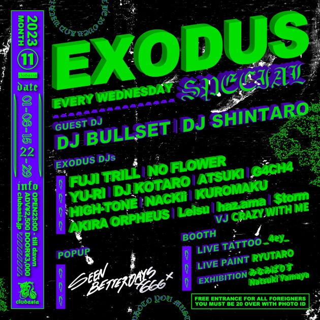 今回100回目を迎え更に祝前日ということで"EXODUS SPECIAL"verでの開催!!GUEST DJにDJ BULLSET, DJ SHINTAROがLINE-UP。そしてFUJI TRILLが展開するアパレル"SEEN BETTER DAYS"666"のPOPUPも決定!!お馴染みのLIVE TATTOO、PAINT 、EXHIBITIONもcheck!!