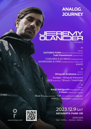 もう1人のゲストDJには日本のクラブシーンの中心地、渋谷において洗練されたオリエンタルなDJバー花魁のプロデューサーでChillout ~ Balearic系のラジオプログラムのナビゲーターを務めるYuki Kawamuraが出演。長きに渡って日本の同シーンを支え続けてきた彼女がJeremy Olander, Satoshi Fumi、Analog Journeyのクルーと共に紡ぐ音の旅は私達を更なる世界へと導いてくれる。