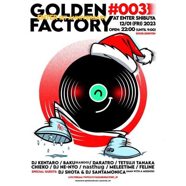 2022年12月15日にオープンしたENTER SHIBUYA。この度、1周年を祝した3週間に及ぶ9日間のアニバーサリーパーティを開催する。記念すべき1周年のオープニングパーティはDJ Kentaro (DMC世界チャンピオン・NINJATUNE所属)が2009から開始した新たなGolden Series「GOLDEN FACTORY」。ENTER SHIBUYAにて、DJのみではなく、音楽愛好家、アート、カルチャーの集合体をテーマに、年齢国籍性別に関わらず、さまざまなアーティストと共にさまざまな内容でお届けする。