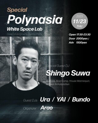 11月のPolynasiaは、ベルリン/ポーランドから一時帰国する世界的著名なDJ/Track MakerのShingo Suwaを再び招致。5月以来の日本帰国後、第1発目のDJとして渋谷の音箱White Space Labにてロング・プレーを披露。都内のアンダー・グラウンドシーンでも実力のあるUra、YAI、Bundoの3名がPartyの前半を彩り、Shingo Suwaは5月に出演以来の150分間のロング・セットを後半にて奏でる。