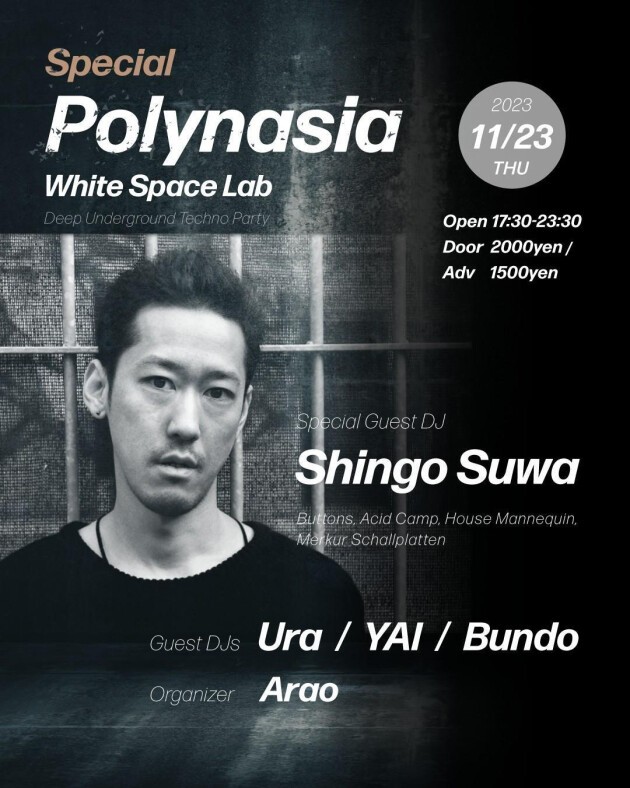 In November, Polynasia will once again welcome world-famous DJ/track maker Shingo Suwa, who is temporarily returning from Berlin and Poland. After returning to Japan in May, he performed a long play at Onbako White Space Lab in Shibuya as his first DJ. Tokyo's underground scene talents Ura, YAI, and Bundo will headline the first half of the party, while Shingo Suwa will appear in the second half, playing his first 150-minute long set since appearing in May.