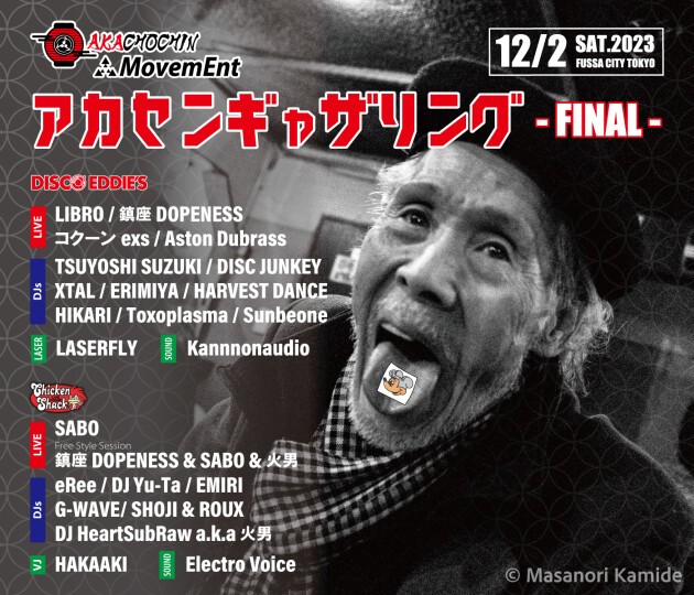なお、DISCO EDDIE'Sは今年いっぱいで立ち退きのため移転することが決定しており、今回をもってアカセンギャザリングはFINALとなる。Flyerの老人は御年80を超えるMr.赤線 エディーさん。49年の歴史を刻んだ現EDDIE'Sでのラストダンスをこの機会に是非!
