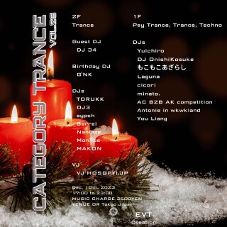 「Category Trance」に関しては、Trance DJに挑戦したい新しいDJを積極的にアサインする方針で運営しており、本イベント出演をきっかけに他イベントにも出演するDJも複数人現れ始めており、日本のTrance界隈を盛り上げるべく開催を続けている。
