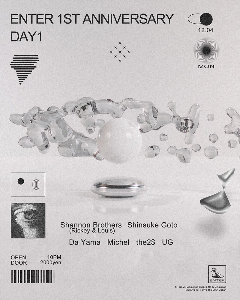 2022年12月15日にオープンしたENTER SHIBUYA。この度、1周年を祝した3週間に及ぶ9日間のアニバーサリーパーティを開催する。記念すべきDAY1はENTER平日、週末ともにテクノを軸としたクラブミュージックでフロアを盛り上げてくれた豪華な面々が揃う。9月1st EPのリリースパーティを盛況におさめ、ENTERでFocusを開催しているRICKEYとLouisによる兄弟ユニットShannon Brothers、渋谷のクラブカルチャーを多数サポートする重要人物Shinsuke Goto、THE GUEST HOUSEのメンバー、ENTERではスピンオフパーティWEEKDAY COMMON ROOMを平日開催しているDa Yama、ハイエナジーな選曲で、渋谷のユースからの支持も厚いHype Sync RecordsのメンバーMichel、mystic and energeticを掲げる国内気鋭のエレクトロレーベル〈ROIRO〉の主宰の1人であり、ENTERでもレーベルローンチパーティや〈ROIRO〉オーガナイズパーティへの出演、独自に音色と音数をブレンドし多数のパーティで活躍するthe2$、さらにENTERのイベントを多数企画し、その他ローカルなクラブを含め渋谷を中心にDJとしても活躍するENTERの要、UGが出演。
