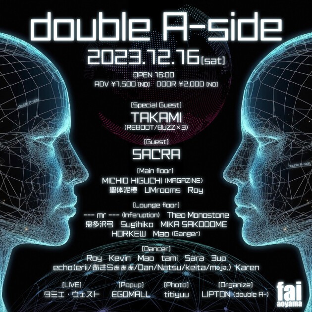 またゲストには今回の「double A-side」のオーガナイザーLIPTON (double A-)と同胞であり、TECHNO, HOUSEを中心に多角的な選曲とMIXセンスで、アンダーグラウンドシーンからも絶大な支持を受けているSACRAをピックアップ。
