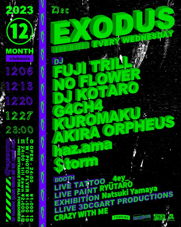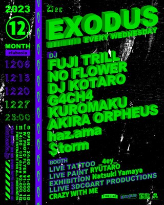FUJI TRILLをはじめ多方面に活躍するDJ,BeatMakerが毎週水曜渋谷の夜をにぎわす通称"エクソ"。LIVE TATTOO、PAINT 、EXHIBITIONも隔週でcheck。外国からのお客様は入場フリー!!是非お越しください!!