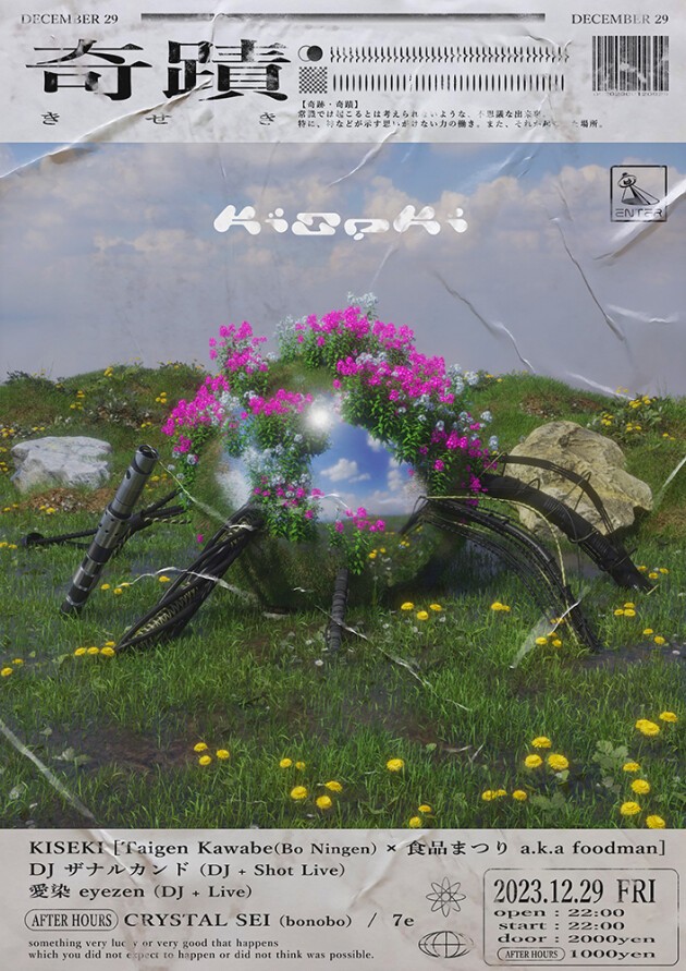 2023年も残り3日となる当日、Bo NingenのTaigen Kawabeと食品まつりa.k.a foodmanが起こすKISEKIとその盟友DJザナルカンドが登場する。今年も各現場でフロアを沸かしてきた面々がラインナップ。東京アンダーグラウンド中野を中心に、マイクパフォーマンス、DJ共に活躍してきた愛染、そしてアフターアワーズには、bonoboのCRYSTAL SEI、SLICKオーガナイザーのが登場する。