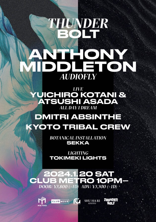 90年代よりアンダーグラウンドを奮わせてきた KYOTO TRIBAL CREW。新年はTHUNDERBOLT を Club Metro にて特別開催!!メインゲストは伝説のデュオ Audioflyの片割れとして知られる Anthony Middleton。