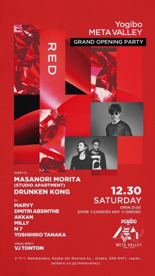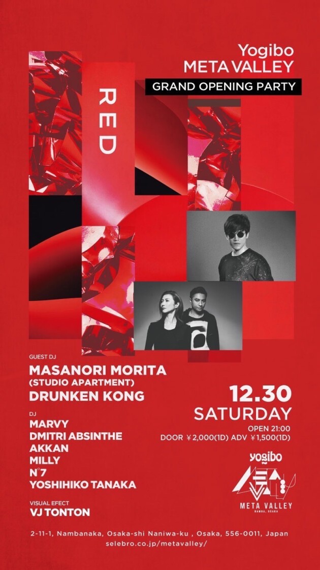 大阪に新たなエンターテイメント施設 “Yogibo META VALLEY” がオープン。その記念すべきオープニングパーティーとして、東京と関西の豪華ラインナップによるMETA VALLEY主催の新パーティ「RED」を開催。