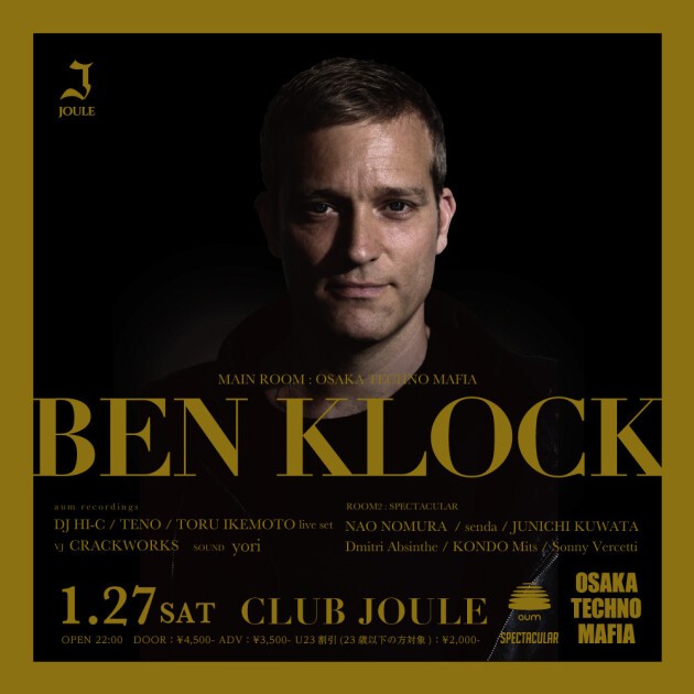 MAIN ROOMはOSAKA TECHNO MAFIAがフロアをメイク。BEN KLOCKの他に大阪発のテクノレーベル<aum recordings>を主宰するToru Ikemoto、DJ HI-C、TENOがサポート。ROOM2ではJOULEのTECHNO PARTY "SPECTACULAR"を開催。世界各地の主要フェスティバルでヘッドライナーを務めるなど地位を確立しているBEN KLOCK。この貴重な来日公演をお見逃しなく。