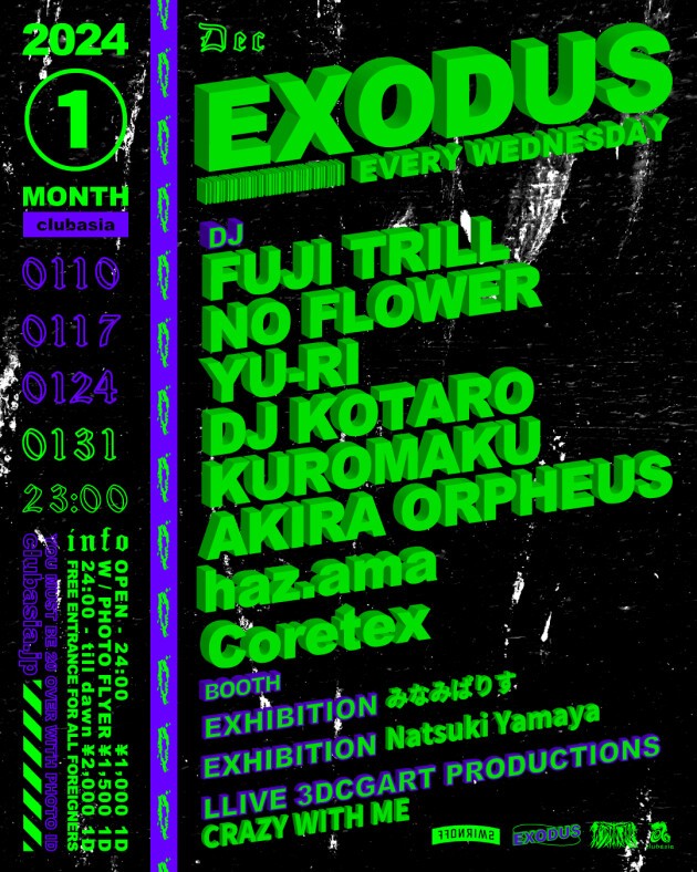 FUJI TRILLをはじめ多方面に活躍するDJ,BeatMakerが毎週水曜渋谷の夜をにぎわす通称"エクソ"。LIVE TATTOO、PAINT 、EXHIBITIONも隔週でcheck。外国からのお客様は入場フリー!!是非お越しください!!