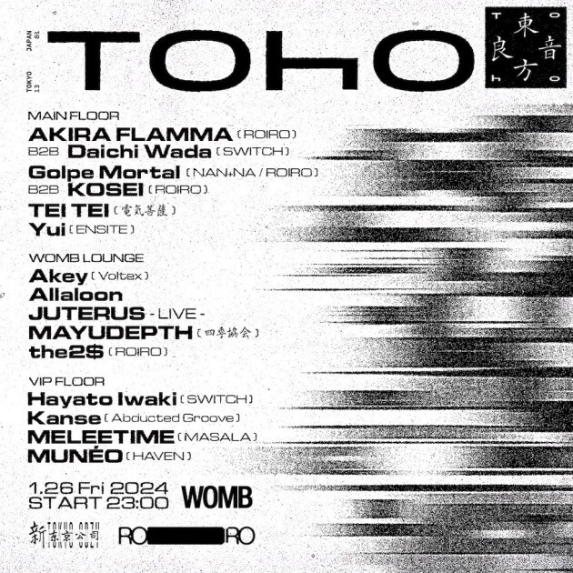 昨年10月にベルリンの Tresor で開催された世界の TECHNO シーンを牽引するクィアパーティー Herrensauna への出演など、ヨーロッパの人気 DJ 達からも脚光を浴びる100% Vinyl DJ の Daichi Wada と、エモーショナルかつレイヴィーな選曲で疾走する Vinyl DJ/プロデューサーの AKIRA FLAMMA による灼熱の B2B や、音楽メディア CVLT Nation の2023 Techno/EBM TOP10 Album に選出されるなど、活躍の場を広げている ROIRO の首謀者 Golpe Mortal と、東京のテクノシーンでアップカミングな存在として期待され、アップテンポかつ力強いビートを軽やかに紡ぐ KOSEI の B2B など、東京最先端の TECHNO を体感させるラインナップが勢揃い。