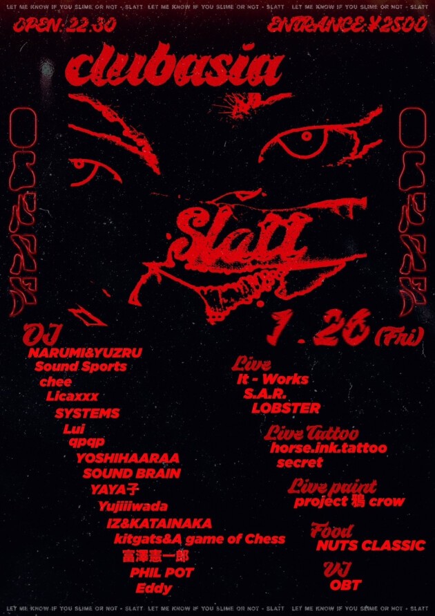 今回のパーティーはSlatt Plan自身が一ファンとして今現在のシーンを盛り上げているアーティスト、私たちのアイデンティティーである同世代のプレイヤーをフックするという動きの中から、アートワーク、タトゥー、アパレル等をチョイスし、ジャンルの垣根を超えた新しい形を表現する。