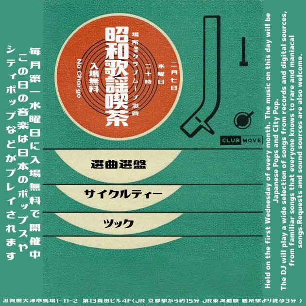 The DJ will play a wide selection of songs from records and digital sources, from familiar songs that everyone knows to rare and maniacal songs.Requests and sound sources are also welcome.