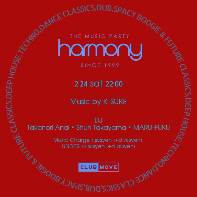 2月のHARMONYは "Takanori Anai" に "Shun Takayama" と初参加の "MARU-FUKU" が登場。DISCOやHOUSEやFUNKやJAZZなどを自由に行き来するクロスオーバーなPLAYをお楽しみに。