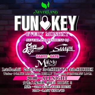 月曜日から楽しみたい人を待ち構える【FUN❤︎KEY】 がNEVERLANDに出現‼️ その扉を開ければ 最高にハッピーな空間が広がり 新旧、ジャンルを問わず最高な音に包まれる さらに月曜日はレディースナイトで 女性は終日入場無料飲み放題! 月曜日から楽しみたい人は集まれ‼️