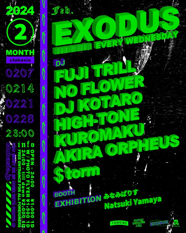 FUJI TRILLをはじめ多方面に活躍するDJ,BeatMakerが毎週水曜渋谷の夜をにぎわす通称"エクソ"。LIVE TATTOO、PAINT、EXHIBITIONも隔週でcheck。外国からのお客様は入場フリー!!是非お越しください!!