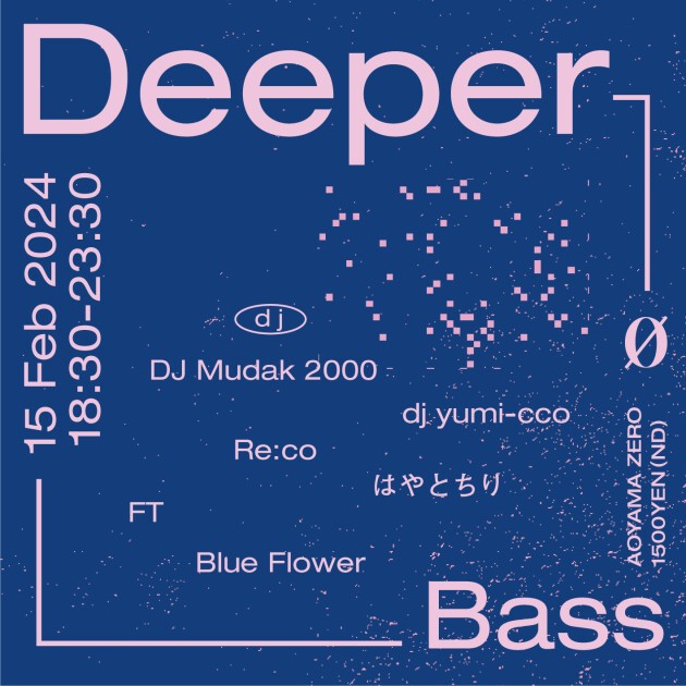 Deeper Bass @AoyamaZero 2月15日(Thu) 18:30~23:30 ¥1,500(ND) DJs DJ Mudak 2000 dj yumi-cco Re:co はやとちり Blue Flower FT