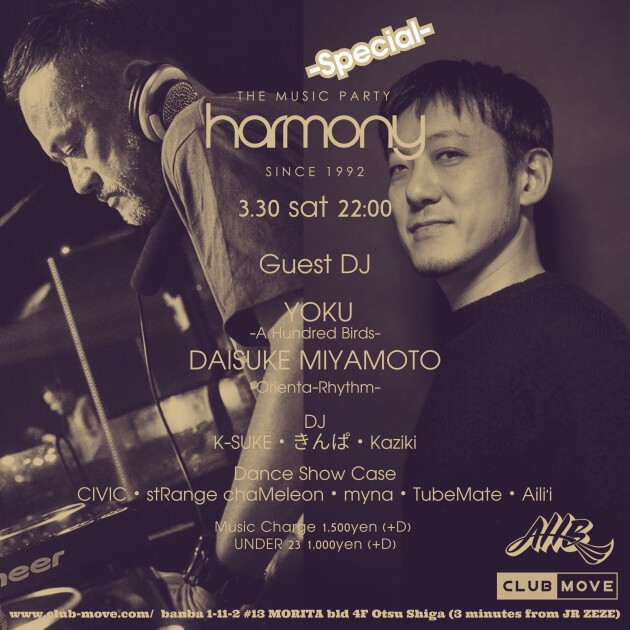 3月のHARMONYは毎年クリスマスに大阪にて行われているダンスミュージックのオーケストラユニット "Hundred Birds Orchestra" のリーダーとして発信し続けている "DJ YOKU (A Hundred Birds)" と "Dubby Disco Boyz" ”DAISUKE MIYAMOTO” 名義でのリリースがTRAXSOURCEやBeatportで軒並みチャートインし各国のDJにプレイされてる "Daisuke Miyamoto (Orienta-Rhythm)" が今年も登場。