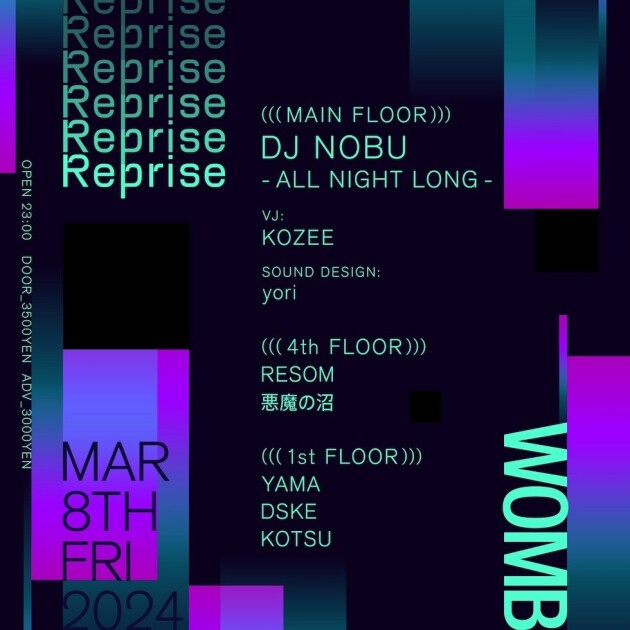 DJ NOBU による WOMB レジデントパーティー Reprise。今回の Reprise は年に一度のお楽しみ、DJ NOBU が渾身の OPEN TO LAST SET を披露。 VJ には昨年の OPEN TO LAST に引き続き DJ NOBU が信頼をよせる VJ KOZEE が、毎回 Reprise では欠かせない存在となっているサウンドデザインを担当する YORI と共に大阪より参戦。