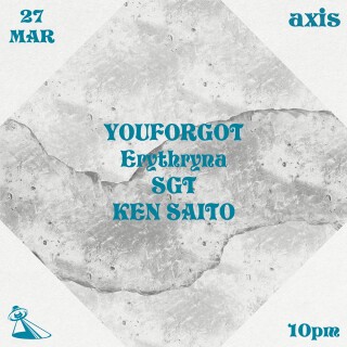 2022年からDJ活動を開始しEnterスタッフの顔を持ち合わせる KEN SAITOが仕掛けるaxis。 東京を拠点に主要なアンダーグラウンドパーティーをボーダーレスに泳ぎ回り、攻撃的なエレクトロニックサウンドでフロアをジャック、Future Terror、Mindgames、Festival de Frue、FUJI & SUN、Balance、-Otsukimi- Open Airなどの野外フェスへの出演に加え、アフターアワーズや小箱への出演などオールラウンドに活躍する名ローカルプレイヤーのYOUFORGOT、ハウス、テクノなど4つ打ちを主軸に幅広いジャンルを巧みに操り、沖縄bar bpmでの様々なパーティ出演を経て、現在東京を拠点に各所のパーティに出演する東間屋スタッフのErythryna、REDBAR第2月曜のレジデントを務めるRED BARスタッフのSGTを迎える。多様な音楽性が交錯していく中で互いのaxisが対応し、真誠を携えながら、不抜の源流に収斂していく様をぜひご覧いただきたい。