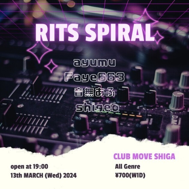 「Rits Spiral」は毎月第2水曜日に開催されている、立命館大学のDJサークル「立命館テクノ部」によるオールジャンルイベントです。