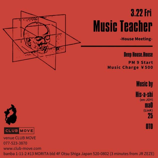 この日はMOVE界隈の様々なイベントからHOUSEのDJが集います。 3/22(金) Music Teacher -House Meeting- (DEEP HOUSE,HOUSE) PM 8 OPEN PM 9 START MUSIC CHARGE¥500 (+D¥700) Music by His-a-shi (en-JOY) / ma0 (LinK) / 25 / OTO
