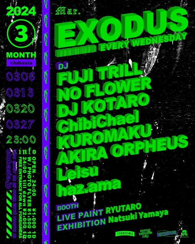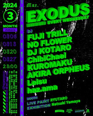 FUJI TRILLをはじめ多方面に活躍するDJ,BeatMakerが毎週水曜渋谷の夜をにぎわす通称"エクソ"。LIVE TATTOO、PAINT、EXHIBITIONも隔週でcheck。外国からのお客様は入場フリー!!是非お越しください!!