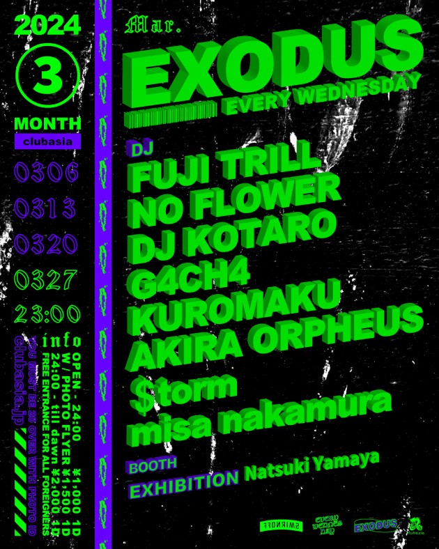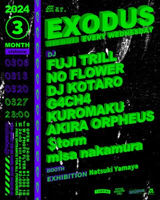 FUJI TRILLをはじめ多方面に活躍するDJ,BeatMakerが毎週水曜渋谷の夜をにぎわす通称"エクソ"。LIVE TATTOO、PAINT、EXHIBITIONも隔週でcheck。外国からのお客様は入場フリー!!是非お越しください!!
