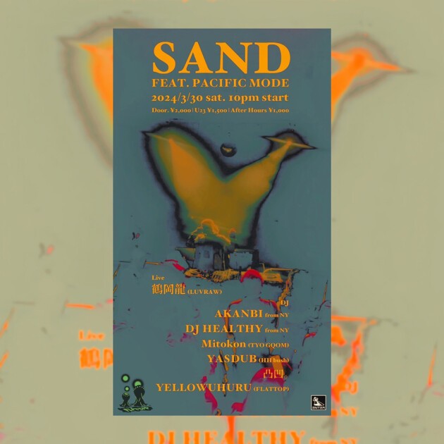 Contactよりハウスやジャズ、テクノ、ヒップホップ、はたまたノイズまで…個々が強固な世界観を持ちながらも、自身の概念で数々の夜で愛好家たちを扇動してきたFLATTOPを主催するYELLOWUHURUが、ENTERにて音楽家達のプレイに重きを置き一夜を過ごせるイベントSANDを開催!
