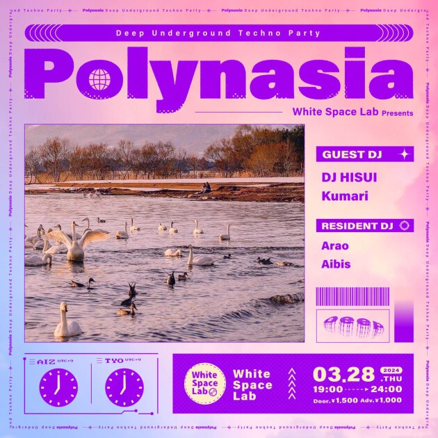 3月のPolynasiaは、会津若松の"DJ BAR 翡翠"の代表であり、情熱のある安定したPlayで東北各地のクラブや野外フェスからブッキングが絶えないHouse DJ「HISUI」を再び招聘。また高円寺KnockにてDowntempo等をメインにした名物Party『1063』を主催するKumariを招致し、春分の候、小箱の木曜日を個性豊かなHouse/Technoで彩る。