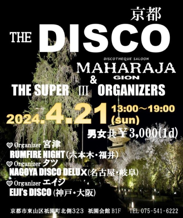 京都のMAHARAJA祇園と北陸・東海・関西を代表する3名の凄腕プロモーターが集まり開催する 「THE SUPER III ORGANIZERS」がお送りするDISCO昼イベント!