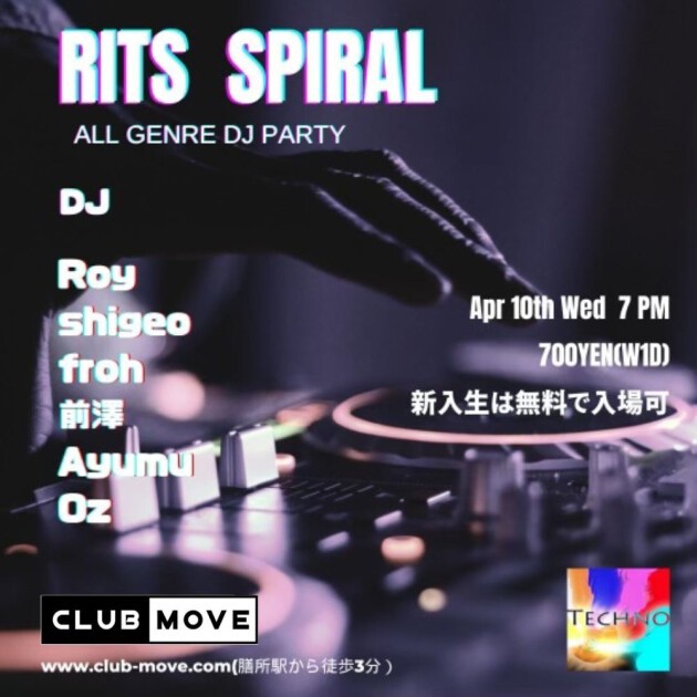 「Rits Spiral」は毎月第2水曜日に開催されている、立命館大学のDJサークル「立命館テクノ部」によるオールジャンルイベントです。