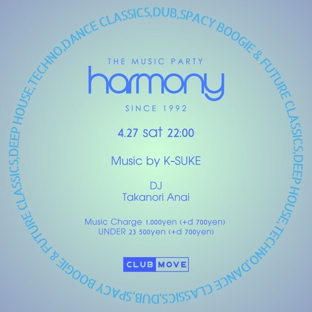 4月のHARMONYはK-SUKEとTakanori Anaiの2マンで音届けいたします。じっくりと1人のDJと向き合う音楽観を堪能して頂きたいです。