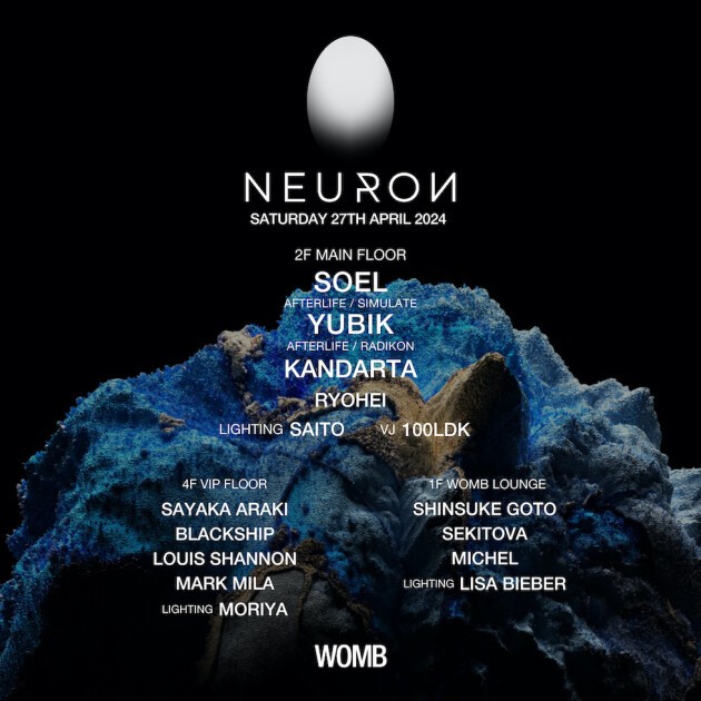 1F WOMB LOUNGE には、日本の新世代 DJ を代表するアーティスト SEKITOVA を筆頭に、エクスペリメンタル、ディープテクノを中心としたプレイで渋谷翠月のレジデントとして根強いファンを掴む Shinsuke Goto、H.S records 主宰兼所属アーティストとしてテクノからヒップホップまで幅広いジャンルを操る Michel が出演。多彩なジャンルを行き来する一夜に Lisa Bieber が光の演出で魅了してくれるだろう。