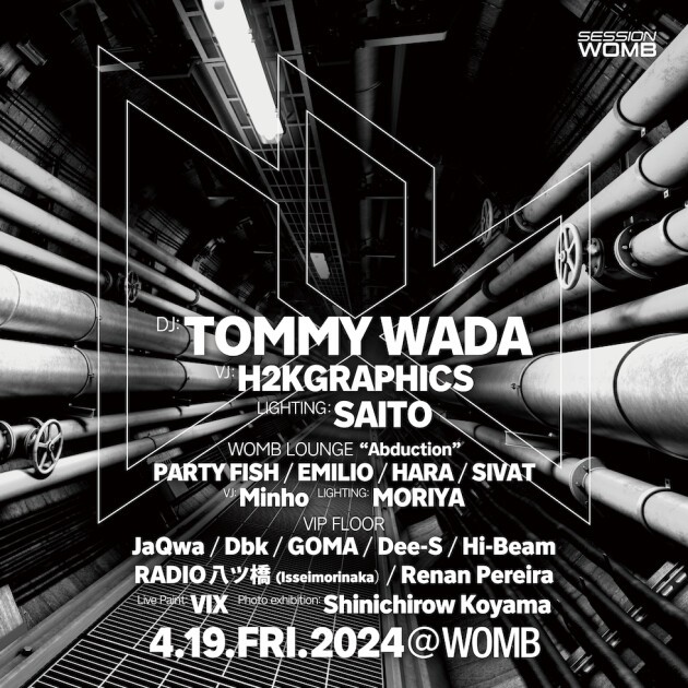 今回はレジデントの TOMMY WADA がオープンからクローズまでフロアをメイク。また、TOMMY WADA のプレイとシンクする、H2KGRAPHICS による映像演出と、LIGHTING SAITO による光の演出が作り出す SESSION の世界観を五感で体感して欲しい。