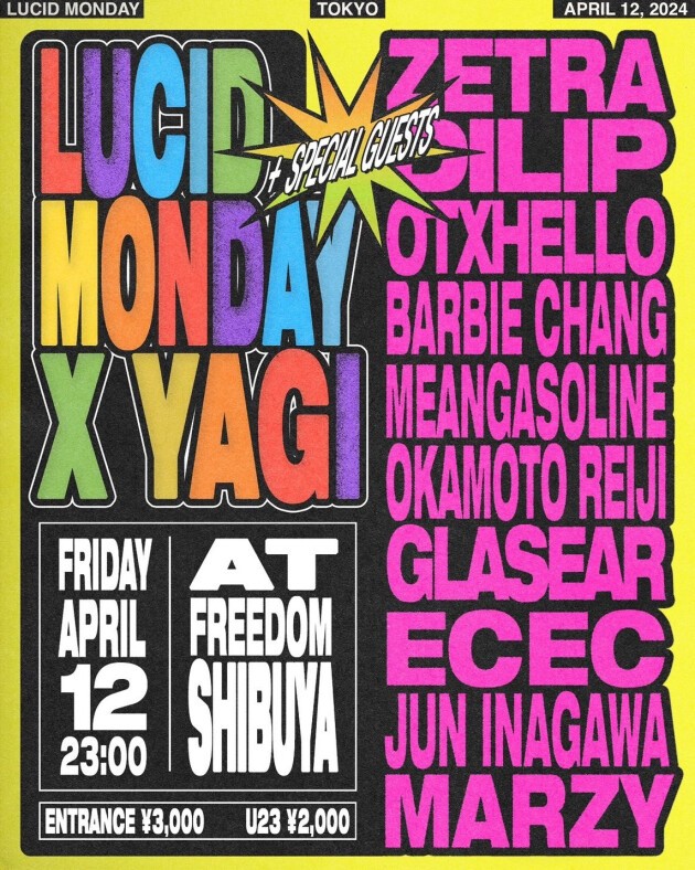 オカモトレイジがキュレーションするカルチャームーブメント"YAGI"とUSAプロデューサーレーベル"LUCID MONDAY"のパーティーがStudio Freedomにて開催! 昨年カナダ出身のプロデューサーWondaGurlやソウルのKollin、LAのlate yearのプレイで爆発的な盛り上がりを見せた、USAプロデューサーレーベルLUCID MONDAYとオカモトレイジがキュレーションするカルチャームーブメント"YAGI"プレゼンツパーティーが今年もStudio Freedomで開催される。 今年はLUCID MONDAYよりZETRA、DILIP、OTXHELLO、BARBIE CHANG、 MEANGASOLINE、GLASEARと6名のプロデューサーの来日となる。 YAGIより、OKAMOTO REIJI、JUN INAGAWA、ECEC、MARZYが出演する。