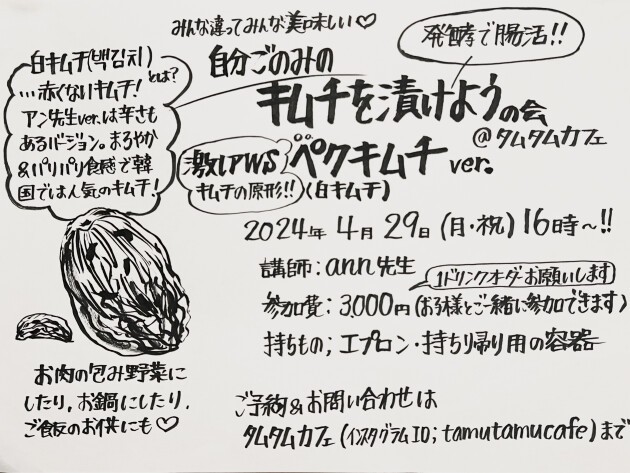 大好評キムチワークショップ第5弾!今回は知らない人もめっちゃ多い、白キムチWSです。日本では知名度は低いのですが、本場韓国では大人気の赤くないキムチ!辛さもにんにくの量もあなたが1番美味しい!となる味にカスタマイズ出来ます♡白キムチのWSはあまり見かけないので、この機会に体験してください。参加した事のある皆さんも、興味あるけどやった事が無い皆さんもぜひ☆飲みだけの見学もできますよ!ご予約は☞ @tamutamucafe まで◎