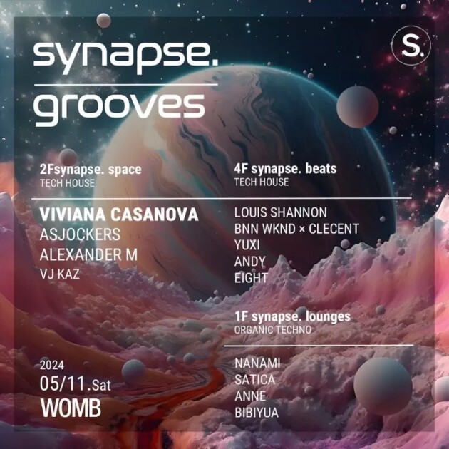 次世代を担うネオテクノパーティー synapse. が国内外の若手を中心に WOMB 全館をフロアメイクする。海外のサウンド・ライティング・空間演出を意識し、さまざまな人達の意識や心(気持ち)を、音楽・空間・体験を通じて細胞レベルで繋げるソーシャルパーティー. 脳内シナプスを形成する上で必要な情報をテクノ(BEAT)を通じて世界(AUDIENCE)に発信する。