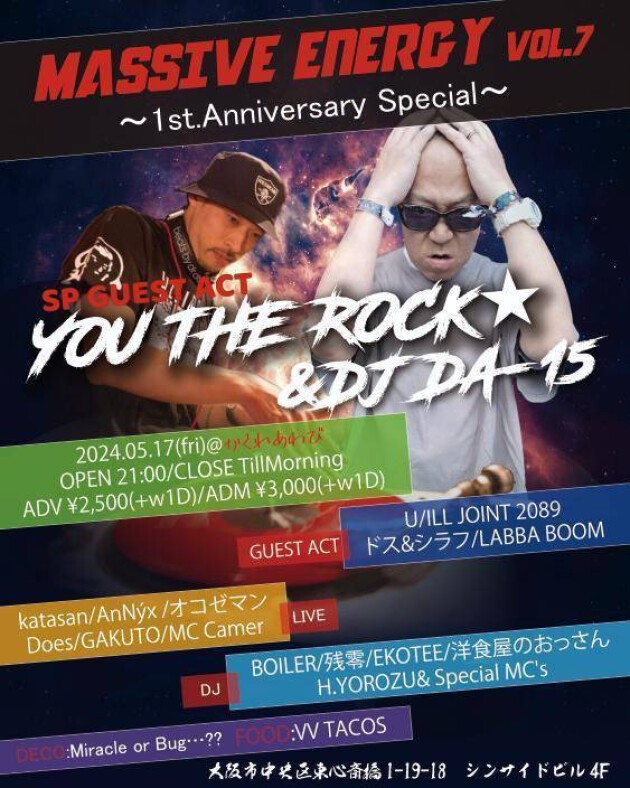 1周年に雷家族/HENTAI GANGよりYOU THE ROCK★&DJ DA-15登場!! SPECIAL SETのライブをご覧あれ!! 迎え撃つ大阪勢も新旧入り乱れエナジーが炸裂するっ!!!!